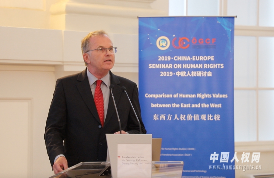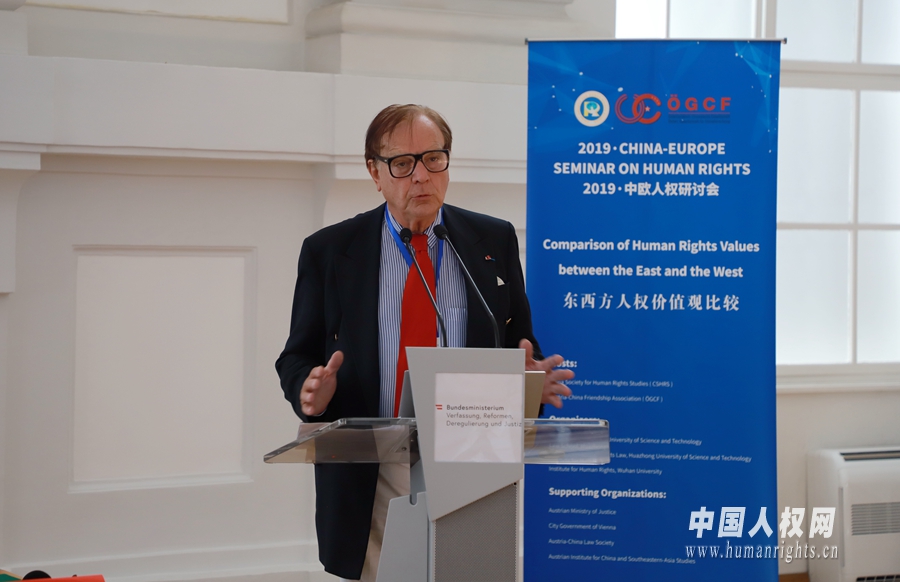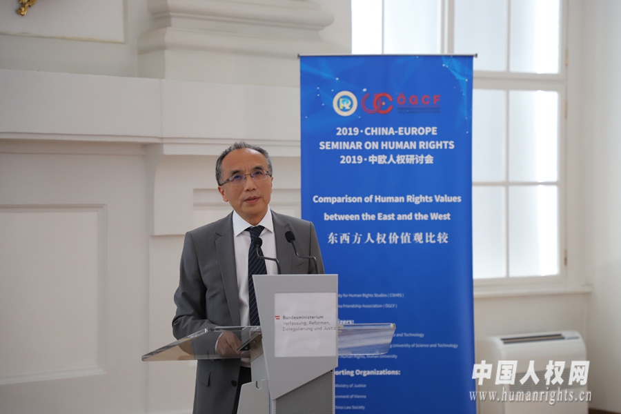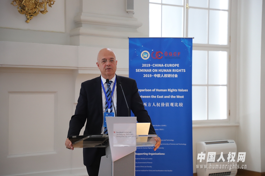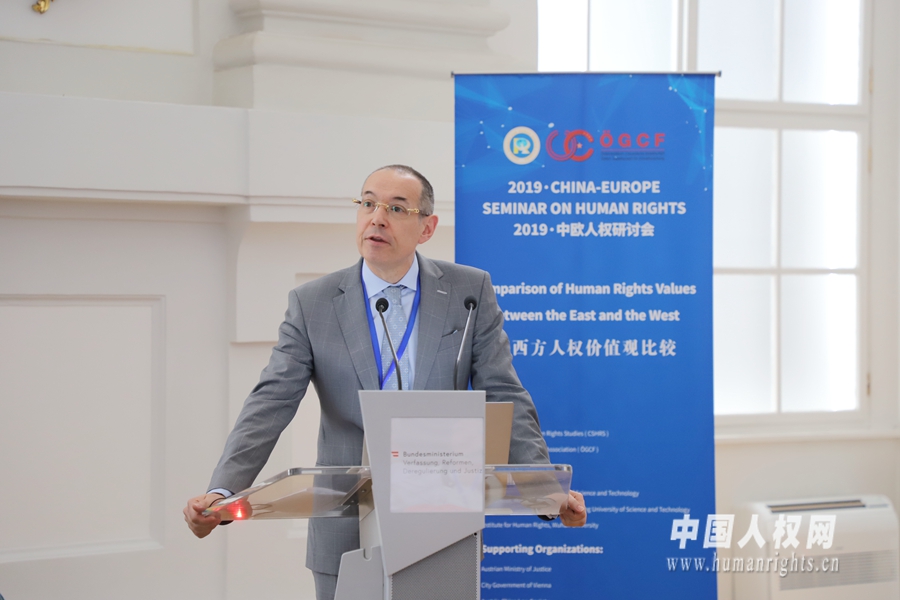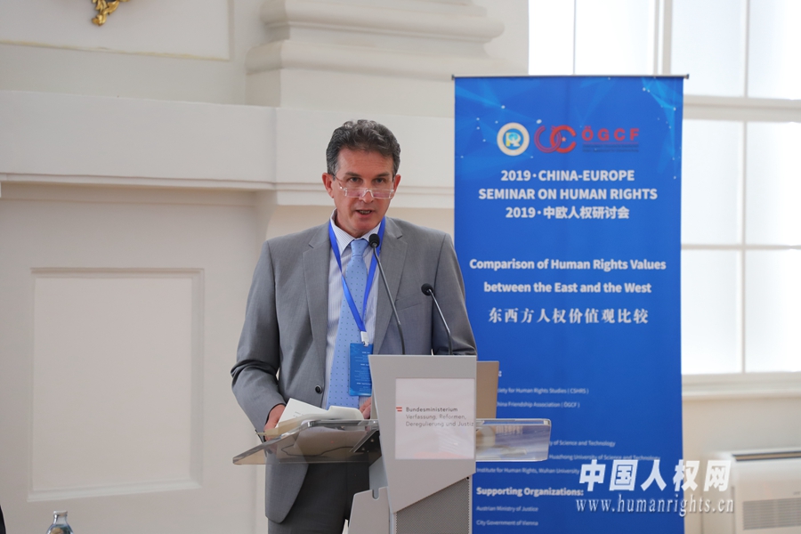 6月21日,由中國人權(quán)研究會和奧中友好協(xié)會共同舉辦的“2019·中歐人權(quán)研討會”在奧地利司法部舉行。研討會主題為“東西方人權(quán)價值觀比較”。”來自中歐人權(quán)領域的近100位專家學者、政府官員、社會組織代表圍繞人權(quán)的普遍性與特殊性、人類命運共同體的人權(quán)意義、人權(quán)價值觀的歷史及其演變、新中國的人權(quán)實踐及其世界意義等內(nèi)容進行了討論。