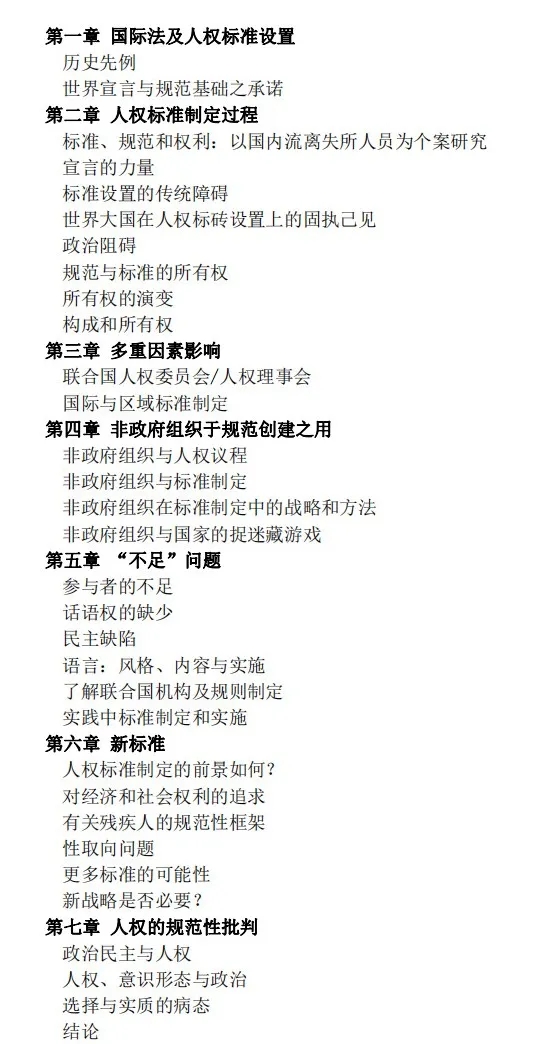 第二章到第四章介紹了南半球參與人權(quán)標(biāo)準(zhǔn)制定的國家需要了解的規(guī)范理論、標(biāo)準(zhǔn)制定技術(shù)、標(biāo)準(zhǔn)制定的障礙、能直接參與制定人權(quán)標(biāo)準(zhǔn)的非政府組織能發(fā)揮的作用等基礎(chǔ)問題。