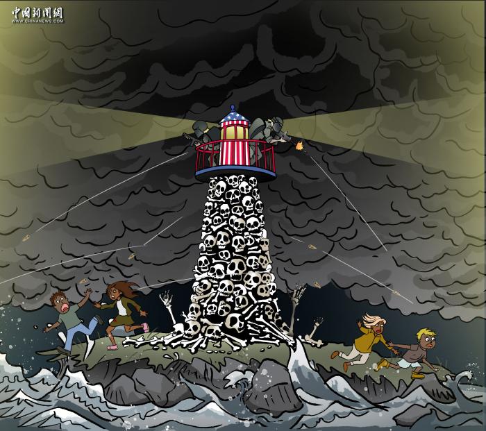 美式“人權(quán)”就如同畫中的燈塔,外觀莊嚴,塔身卻堆滿了骸骨。這不僅象征過去的罪行,也在持續(xù)上演著對人權(quán)的踐踏。