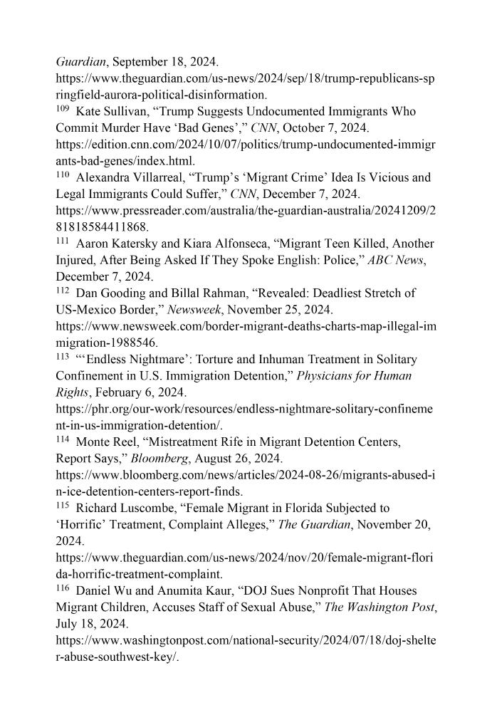 政客公然煽動對移民的仇視。有關(guān)移民的虛假和誤導(dǎo)性信息廣泛傳播。107英國《衛(wèi)報》網(wǎng)站2024年9月18日報道,在2024年美國整個選舉周期中,一些政客廣泛散布有關(guān)非洲裔和拉美裔移民的謠言,以致關(guān)于移民的種族主義陰謀論甚囂塵上。專家指出,政客為謀取政治利益?zhèn)鞑ヒ泼裉摷傩畔ⅲL了美國人對移民的仇視。108美國有線電視新聞網(wǎng)2024年10月7日報道,政客在競選中針對無證移民使用有辱人格的言辭,指控“他們中的殺人犯具有壞基因”。109科羅拉多州奧羅拉市有五分之一的居民出生于國外。政客在競選中不斷地把移民,特別是有色人種移民,妖魔化為對美國安全的威脅,宣稱要針對移民實施大規(guī)模驅(qū)逐和家庭分離政策,使當(dāng)?shù)鼐用裣萑肟只拧?sup>110政客煽動激化了社會上的反移民情緒。美國廣播公司網(wǎng)站2024年12月7日報道,在紐約市,3名成年人詢問2名移民青少年是否會說英語,當(dāng)對方回答不會說時,便拔刀刺向他們,造成1死1傷。111