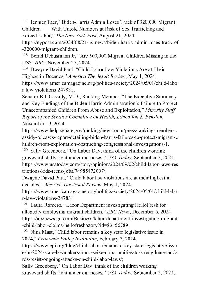 數(shù)十萬移民兒童下落不明。移民兒童入境美國后,被迫與家庭分開拘留,在被釋放后失聯(lián),等待他們的是被剝削、虐待、強迫勞動甚至面臨生命危險。英國廣播公司網(wǎng)站2024年11月27日報道,由于政府將入境的無陪伴移民兒童釋放給“未經(jīng)妥善審查”的美國境內(nèi)的成年擔(dān)保人,2018年至2023年9月,共有超過32萬名無父母陪伴的移民兒童在美國失去行蹤。117其中許多兒童可能被誘騙從事強迫勞動和性交易,處于被虐待、剝削和販運的境地。118