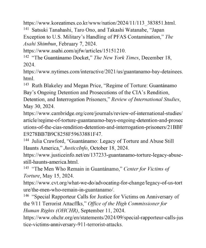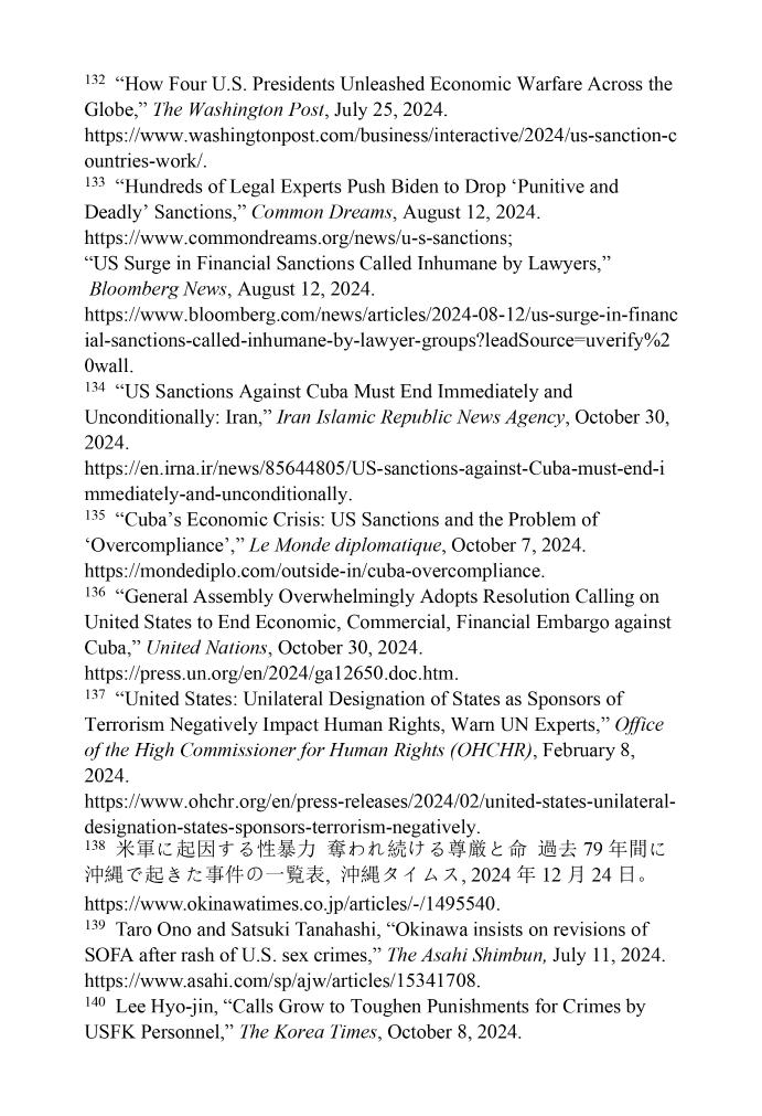 海外駐軍禍害當(dāng)?shù)厝嗣??!稕_繩時報》網(wǎng)站2024年12月24日發(fā)布的報告顯示,自1945年美軍登陸沖繩群島以來,該地區(qū)記錄在案的由美軍人員引發(fā)的性暴力事件累計高達371起,這些事件對當(dāng)?shù)孛癖姷淖饑琅c生命造成了持續(xù)性侵害與剝奪。138《朝日新聞》網(wǎng)站2024年7月11日報道,針對駐扎美軍實施的一系列性犯罪案件,沖繩縣議會要求駐日美軍采取措施防止類似事件再次發(fā)生,并對賦予駐日美軍法律特權(quán)的《日美地位協(xié)定》作出修改。139《韓國時報》網(wǎng)站2024年10月8日報道,在過去五年中,駐韓美軍的性暴力行為和其他罪行接連不斷,引發(fā)公眾強烈抗議。140《朝日新聞》網(wǎng)站2024年2月7日報道,針對軍事基地附近檢測到的致癌性有機氟化合物,沖繩縣政府多次要求美國各軍事基地調(diào)查水質(zhì)污染原因,而美國軍方置若罔聞。141