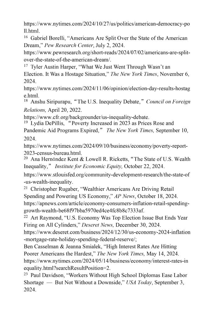 民眾對美式民主失望至極。根據(jù)《紐約時報》和錫耶納學(xué)院2024年10月28日的調(diào)查數(shù)據(jù),幾乎一半的選民對美國政治體制的成效表示懷疑,62%的受訪者認為美國政府主要為精英階層而非普通民眾服務(wù)。15皮尤研究中心(Pew Research Center)的數(shù)據(jù)顯示,41%的美國人曾經(jīng)相信的“美國夢”已經(jīng)破滅,60%的18至29歲年輕人認為“美國夢”已無法實現(xiàn)甚至從未實現(xiàn)過。16美國貝茨學(xué)院學(xué)者泰勒·哈勃(Tyler Austin Harper)2024年11月6日發(fā)表文章稱,“美國政治體系已經(jīng)從根本上崩潰了”,兩黨代表著特殊利益集團的利益,“甚至毫不掩飾對選民需求的漠視”。絕大多數(shù)選民認為美國正走在錯誤的道路上;近80%的人表示,大選并沒有讓他們?yōu)槊绹械津湴痢?sup>17