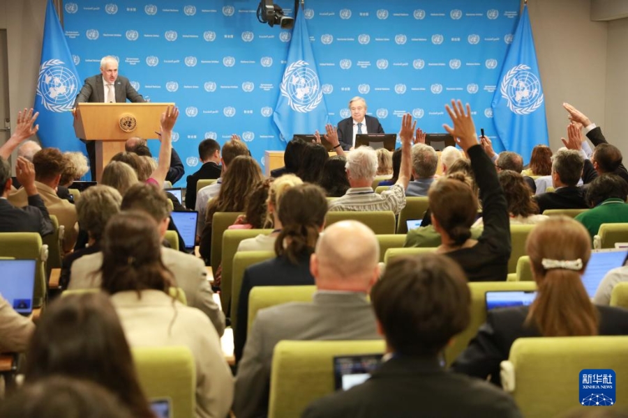 9月16日,在位于紐約的聯合國總部,記者在聯合國秘書長古特雷斯舉行的新聞發(fā)布會上舉手提問。新華社記者謝鍔攝