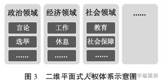 傳統(tǒng)人權體系如在二維平面中繪制地圖一般,其體系依據(jù)社會生活的不同領域而建立,相關領域又可進一步細分為不同部門。這些領域、部門對應著各類人權,也能據(jù)此確定相關人權的獨特性、權利內(nèi)容及邊界。如下圖所示,社會生活大體上可以分為政治、經(jīng)濟、社會等領域,與之對應的便是政治權利、經(jīng)濟權利、社會權利等較為宏觀的人權。在此基礎上,以政治領域為例,又可細分為言論、選舉等一系列具體部門,與之對應的便是言論自由、選舉權等更為具體的人權。隨著人類社會的發(fā)展變化,可能會出現(xiàn)新的領域、部門,既有的領域、部門也會面臨新的劃分需求,由此影響新興權利的形成等問題,但這仍是以二維平面式的視角進行的分析。