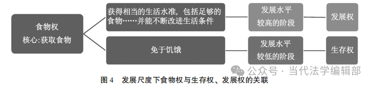 具體而言,在三維立體式人權體系中,生存權與發(fā)展權在發(fā)展的尺度中緊密聯(lián)系、有機銜接。二者的關切內(nèi)容都不限于社會生活的單一領域、部門,但也不是多領域、部門的簡單相加。如下圖所示,以食物權為例,“獲得食物”既是食物權的固有內(nèi)容,又是生存權與發(fā)展權的關切事項。如果仍在二維平面式的傳統(tǒng)人權體系中分析食物權、生存權和發(fā)展權,難免陷入矛盾。若通過導入發(fā)展尺度使“獲取食物”立體化,便能更好地理解三者的關系。