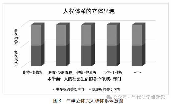 因此,基于馬克思主義人權觀、當代中國人權觀,在三維立體式人權體系中,我們可以在人的社會生活的具體領域、部門認識各項人權,并在這些領域、部門的發(fā)展維度認識生存權和發(fā)展權。這便能有效地避免二維平面式的傳統(tǒng)人權體系中“多項人權擁擠于一隅”的窘境,明確生存權、發(fā)展權與各項人權的彼此內(nèi)涵和相互關系,由此澄清前文所述的生存權的模糊性,進而更好地指導生存權在國內(nèi)、國際的具體實踐。