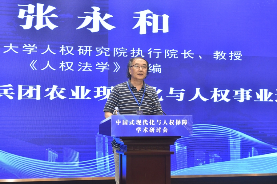 “中國式現(xiàn)代化與人權保障”學術研討會16日在山東濟南舉行。圖為西南政法大學人權研究院執(zhí)行院長、教授、《人權法學》主編張永和作題為《新疆生產(chǎn)建設兵團農業(yè)現(xiàn)代化與人權事業(yè)進步》的大會發(fā)言。主辦方供圖