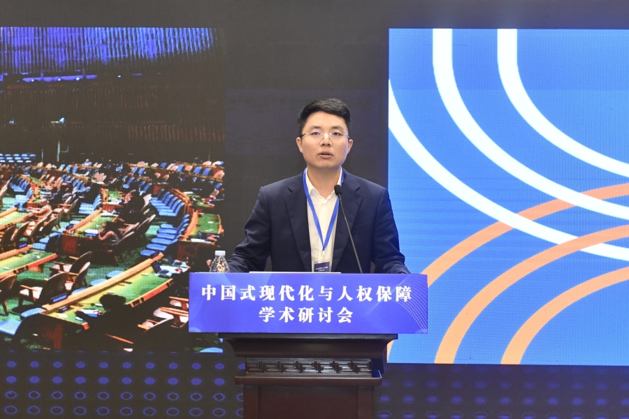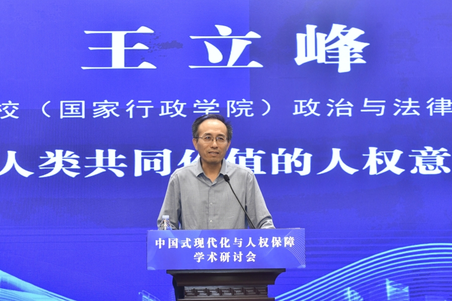 “中國式現(xiàn)代化與人權保障”學術研討會16日在山東濟南舉行。圖為中共中央黨校(國家行政學院)政治與法律教研部教授王立峰作題為《全人類共同價值的人權意涵》的大會發(fā)言。主辦方供圖