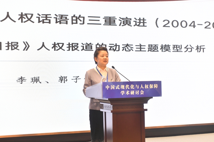 “中國式現(xiàn)代化與人權保障”學術研討會16日在山東濟南舉行。圖為西南政法大學新聞傳播學院教授李珮作題為《憲法化到現(xiàn)代化:中國人權話語的三重演進(2004 -2024)》的大會發(fā)言。主辦方供圖