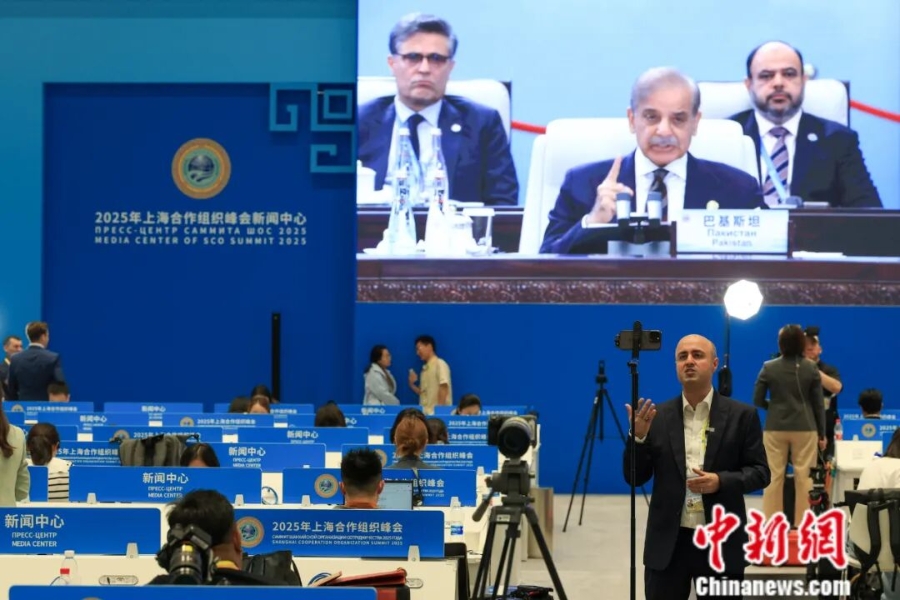 2025年9月1日,天津,外國(guó)記者在2025年上海合作組織峰會(huì)新聞中心進(jìn)行直播。中新社記者 佟郁 攝