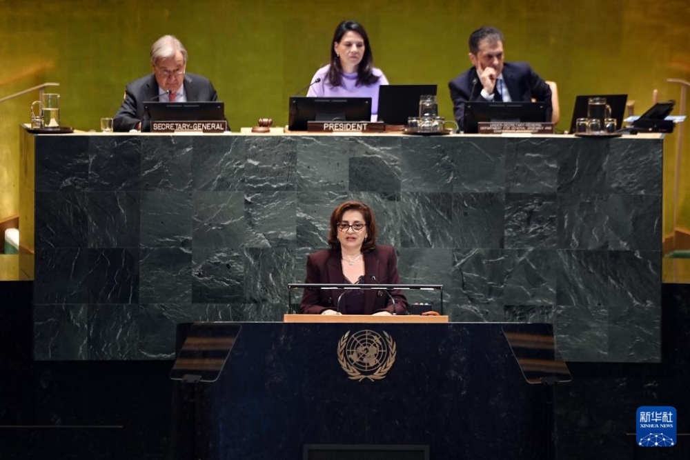9月22日,在位于紐約的聯(lián)合國總部,聯(lián)合國副秘書長、聯(lián)合國婦女署執(zhí)行主任巴胡斯在紀念北京世婦會30周年高級別會議上講話。新華社記者 李睿 攝