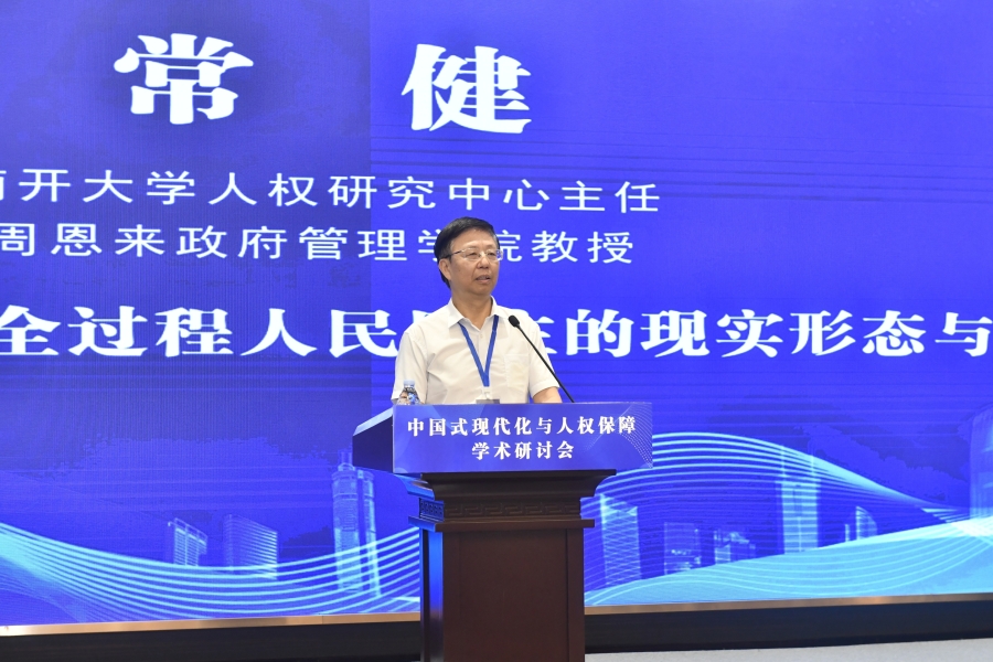 “中國式現(xiàn)代化與人權保障”學術研討會16日在山東濟南舉行。圖為南開大學人權研究中心主任、周恩來政府管理學院教授常健作題為《現(xiàn)代國家治理視域下全過程人民民主的現(xiàn)實形態(tài)與保障機制》的主旨演講。主辦方供圖