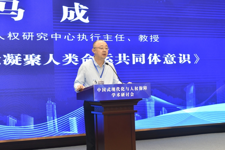 “中國(guó)式現(xiàn)代化與人權(quán)保障”學(xué)術(shù)研討會(huì)16日在山東濟(jì)南舉行。圖為西北政法大學(xué)人權(quán)研究中心執(zhí)行主任、教授馬成在“平行論壇(一)上半場(chǎng):中國(guó)式現(xiàn)代化進(jìn)程中的人權(quán)理論創(chuàng)新”作題為《以國(guó)際愛(ài)國(guó)理念凝聚人類命運(yùn)共同體意識(shí)》的發(fā)言。主辦方供圖