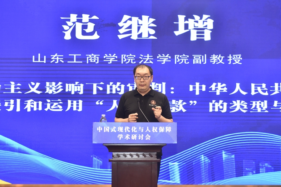 “中國(guó)式現(xiàn)代化與人權(quán)保障”學(xué)術(shù)研討會(huì)16日在山東濟(jì)南舉行。圖為山東工商學(xué)院法學(xué)院副教授范繼增在“平行論壇(一)下半場(chǎng):中國(guó)式現(xiàn)代化進(jìn)程中的人權(quán)執(zhí)法司法保障”作題為《司法能動(dòng)主義影響下的審判:中華人民共和國(guó)法院能動(dòng)性援引和運(yùn)用“人權(quán)條款”的類型與評(píng)價(jià)》的發(fā)言。主辦方供圖