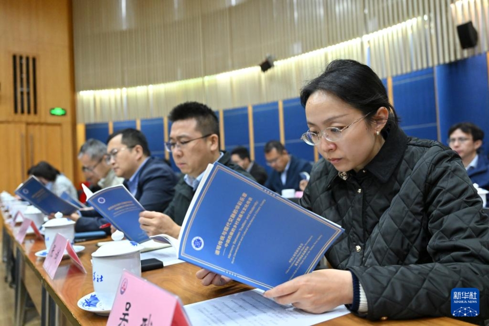 10月16日,在北京舉行的“西藏的鄉(xiāng)村發(fā)展與文化傳承”專家座談會上,與會嘉賓翻閱《譜寫傳統(tǒng)與現(xiàn)代交融的華彩樂章——中國西藏的鄉(xiāng)村發(fā)展與文化傳承》智庫報告。新華社記者 李鑫 攝