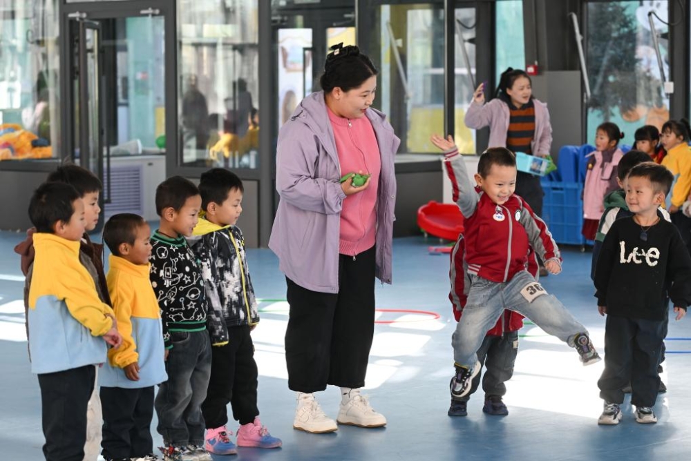2024年11月14日,在青海天峻縣民族幼兒園,小朋友們在老師帶領(lǐng)下上體育課。新華社記者 張龍 攝